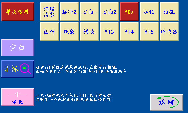 七、手动操作 单次送料:停机状态下,点击此键,送一次料后停止。 点进:在停止状态下,手动伺服(步进)电机正转。 点退:在停止状态下,手动伺服(步进)电机反转,在运行状态下此键变为“补数”,按此键计数减1。 寻标:当‘寻标’键选择“深色/浅色”时按此键,伺服(步进)电机一直转到深色的色标点自动 停转时,设置为“追深”;伺服(步进)电机一直转到浅色的色标点自动停转时,设置为“追浅。 当‘寻标’键选择“空白”时,按此键无效