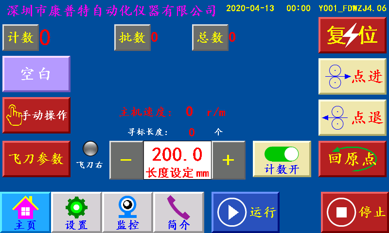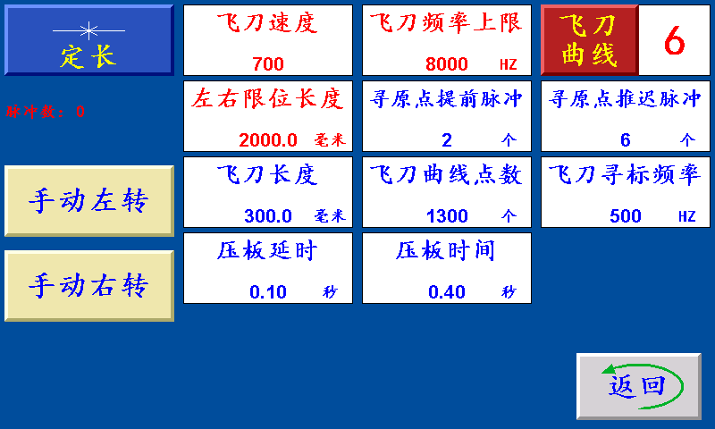 三、主页 长度设定:显示制袋所设定长度,单位:毫米(也可以当按键直接调节长度) 计数开/计数关:控制每次送料是否需要计数。 回原点:点击此键,控制机械手回到原点前限。 飞刀参数:点击此键,进入飞到参数设置界面。 计数/清零:单批次累计到一批个数结束时,个数自动归零;按“计数/清零”键清零清个数。 批数/清零:一批结束后,批数加“1”, 总数/清零:个数每加一个,总数加“1”;按“总数/清零”键清零总数。 空白/深色/浅色:三种状态切换。 空白:指光电忽略色标光电传感器信号; 深色:指跟踪印刷制品时,以深颜色的色标点为跟踪点; 浅色:指跟踪印刷制品时,以浅颜色的色标点为跟踪点。 寻标:当‘寻标’键选择“深色/浅色”时按此键,伺服(步进)电机一直转到深色的色标点自动停转时,设置为“追深”;伺服(步进)电机一直转到浅色的色标点自动停转时,设置为“追浅。 当‘寻标’键选择“空白”时,按此键无效 点进:在停止状态下,手动伺服(步进)电机正转。 点退:在停止状态下,手动伺服(步进)电机反转,在运行状态下此键变为“补数”,按此键计数减1。 复位:系统不能正常工作时,按此键程序重新启动,也可以做紧急停机用。 运行:按此键,主机正常运行。(长按3秒左右) 停止:按此键,霍尔开关GK1检测到高位停机信号;主机自动停机。 状态显示:运行/停止/暂停/脱标/不在左限/右限,六种状态切换显示。 运行:按启动键后显示“运行”。 停止:通电后一直显示“停止”。 暂停:当机型选择“暂停”时一批结束停机N秒后主机自动开机。 脱标:在制作印刷制品时没有跟踪到色标点显示“脱标”。 不在左限:启动或者运行过程中,飞刀伺服(步进)电机没回到原点时,显示不在左限。 右限:运行过程中,飞刀伺服(步进)电机跑到右限位,显示“右限”