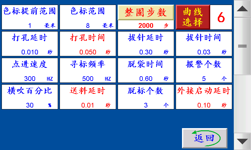 五、副菜单 色标范围:制作彩色制品时,伺服(步进)电机以恒定的速度寻找色标点的范围(即色标光电在『长度—设定的色标范围长度』范围内寻找色标,寻至『长度+设定的色标范围长度』。 色标提前范围:制作彩色制品时,伺服(步进)电机在料送结束之前,提前以恒定的速度寻找色标。 打孔延时:送料结束后延时此参数设定的时间后打孔信号输出。 打孔时间:伺服(步进)电机转结束,打孔电磁阀工作的时间。 拔针延时:一批结束后延时此参数设定的时间后拔针信号输出。 拔针时间:一批结束后延时“拔针延时”的时间后拔针信号输出,跟脱袋信号一起断开。 横吹百分比:由输入点X01送料信号控制横吹信号输出,输出时间由此参数来设定调节。 脱袋时间:一批结束后延时“拔针延时”加“拔针时间”的时间后脱袋信号输出,时间结束后跟拔针信号一起断开。 报警个数:一批结束前提前N个报警。 点进速度:伺服(步进)电机的点进/点退时的速度,设定越大,伺服(步进)电机的转速越快。 寻标频率:伺服(步进)电机追色标时的速度,设定越大,伺服(步进)电机的转速越快。 外接启动延时:点击外接启动按钮时,持续该时间后主机开始启动。 送料延时:下一次送料时,延时送料延时时间后开始送料。 脱标个数:设定N个,制作彩色制品时,跟踪N次色标点,跟踪不住自动停机。 整圈步数:伺服(步进)电机转一圈所需要的脉冲个数。 曲线慢速/曲线中速/曲线快速/曲线高速,4种不同的曲线切换。