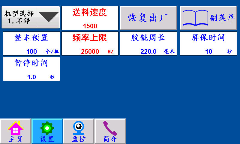 四、设置 不停/暂停/停机:“不停”:一批结束主机不停,继续正常工作。 “暂停”:一批结束主机暂停,停到暂停时间结束,主机自动开机。 “停机”:一批结束主机自动停机后不再运行,手动按启动键方可运行。 恢复出厂:按此键恢复出厂设置(慎用)。 副菜单:点击此键进入副菜单界面。 整本预置:一批设定的个数,提前5个报警。单位:个 送料速度:伺服(步进)电机的加减速时间,设定越大,伺服(步进)电机起步越快。 胶辊周长:伺服(步进)电机带动橡胶辊转一圈的长度。 暂停时间:当机型选择暂停,一批结束后主机自动停机所设定的时间。 频率上限:伺服(步进)电机的最高转速,设定越大,伺服(步进)电机的转速越快。 屏保时间:主机运行状态下,在主界面停留此时间进入屏保状态。(设置0则屏保无效)