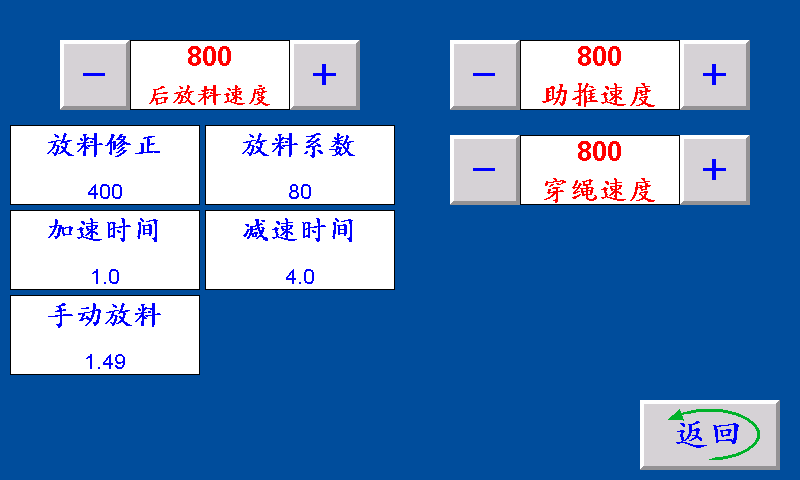 后放料速度:控制后放料电机的转速快慢。 手动放料:停机状态下,手动放料的速度。 放料修正:控制后放料电机的加减速快慢,设定值越小越快。 放料系数:控制后放料速度加减变化的当量。 加速时间:主机启动后,后放料起步加速到最高速所需的时间。 减速时间:主机停止后,后放料从最高速减到最低速所需的时间。