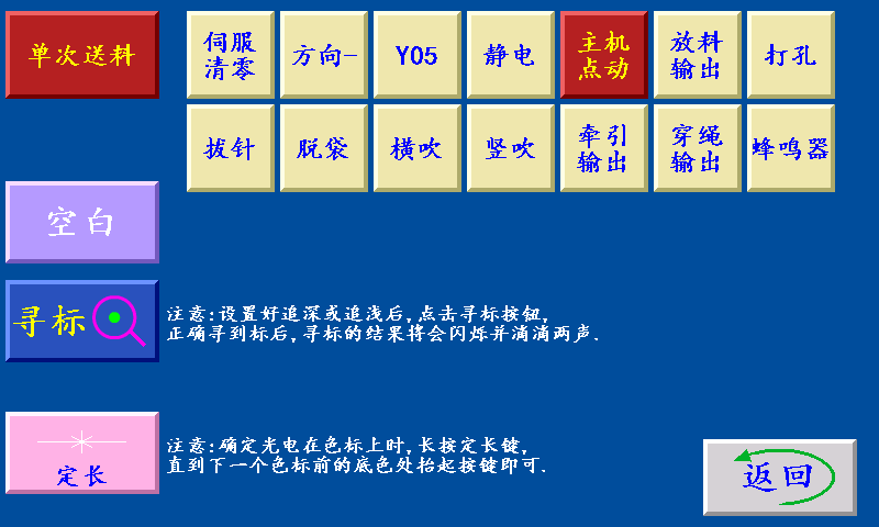 六、手动操作 单次送料:停机状态下,点击此键,送一次料后停止。 寻标:当‘寻标’键选择“深色/浅色”时按此键,伺服(步进)电机一直转到深色的色标点自动 停转时,设置为“追深”;伺服(步进)电机一直转到浅色的色标点自动停转时,设置为“追浅。 当‘寻标’键选择“空白”时,按此键无效 (注释:黄色按键在停机状态下,测试脚位是否正常) 七、放料设置界面