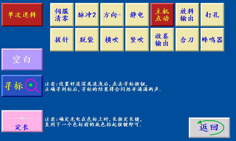 寻标:当‘寻标’键选择“深色/浅色”时按此键,伺服(步进)电机一直转到深色的色标点自动 停转时,设置为“追深”;伺服(步进)电机一直转到浅色的色标点自动停转时,设置为“追浅。