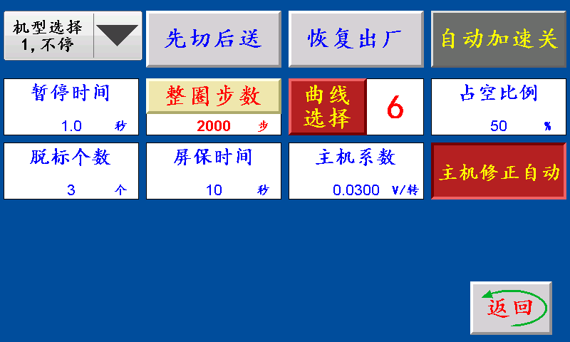 四、主菜单 不停/暂停/停机:“不停”:一批结束主机不停,继续正常工作。 “暂停”:一批结束主机暂停,停到暂停时间结束,主机自动开机。 “停机”:一批结束主机自动停机后不再运行,手动按启动键方可运行。 “空切”:一批结束主机继续空切,脱袋滞后时间结束后继续送料。 曲线选择:1~9,步进电机默认1,伺服电机默认6 先切后送/先送后切:“先切后送”:按启动键,主机先运行,GK1霍尔开关检测到伺服(步进)电机的送料信号,伺服(步进)电机开始送料。 “先送后切”:按启动键,伺服(步进)先送料,送料结束后主机再运行。 恢复出厂:按此键恢复出厂设置(慎用)。 暂停时间:当机型选择暂停,一批结束后主机自动停机所设定的时间。 占空比例:“自动送料”时,主机运行一个周期送料所占的时间比例。 脱标个数:设定N个,制作彩色制品时,跟踪N次色标点,跟踪不住自动停机。 自动加速关/自动加速开:自动加速关:自己调节送料速度 自动加速开:根据设定的袋长等自动调节送料速度 整圈步数:伺服(步进)电机转一圈所需要的脉冲个数。 屏保时间:主机运行状态下,在主界面停留此时间进入屏保状态。(设置0则屏保无效) 主机修正手动/主机修正自动: 主机修正手动:手动调节主机系数来改变主机速度 主机修正自动:自动修正好主机速度对应的主机系数大小。