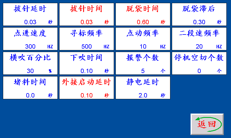 五、副菜单 拔针延时:一批结束后延时此参数设定的时间后拔针信号输出。 拔针时间:一批结束后延时“拔针延时”的时间后拔针信号输出,跟脱袋信号一起断开。 脱袋时间:一批结束后延时“拔针延时”加“拔针时间”的时间后脱袋信号输出,时间结束后跟拔针信号一起断开 脱袋滞后:一批结束后脱袋信号关闭后持续的时间。 点进速度:伺服(步进)电机的点进/点退时的速度,设定越大,伺服(步进)电机的转速越快。 寻标频率:伺服(步进)电机追色标时的速度,设定越大,伺服(步进)电机的转速越快。 点动频率:停止状态下,X04(点动)收到信号时,Y07主机信号输出,切刀上下运行,速度由此参数调节。 二段速频率:主机运行时按停止键,主机切换成二段速停机,二段速速度由此参数调节。 横吹百分比:由输入点X01送料信号控制横吹信号输出,输出时间由此参数来设定调节。 下吹时间:由输入点下吹输入控制下吹信号输出,时间由此参数来设定调节。 外接启动延时:点击外接启动按钮时,持续该时间后主机开始启动。 报警个数:一批结束前提前N个报警。 停机空切个数:每次停机时,主机需要空切的次数。 堵料时间:连续收到堵料信号“堵料时间”后,主机高位停止,显示故障“堵料”