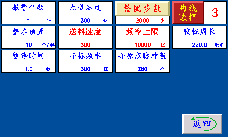 三、设置 整本预置:一批设定的个数,提前5个报警。单位:个 报警个数:一批结束前提前N个报警。 暂停时间:当机型选择暂停,一批结束后主机自动停机所设定的时间。 点进速度:伺服(步进)电机的点进/点退时的速度,设定越大,伺服(步进)电机的转速越快。 寻标频率:伺服(步进)电机追色标时的速度,设定越大,伺服(步进)电机的转速越快。 寻原点脉冲数:卷筒回原点限位时,提前寻原点脉冲数开始寻原点限位。 送料速度:伺服(步进)电机的加减速时间,设定越大,伺服(步进)电机起步越快。 频率上限:伺服(步进)电机的最高转速,设定越大,伺服(步进)电机的转速越快。 胶辊周长:伺服(步进)电机带动橡胶辊转一圈的长度。 整圈步数:伺服(步进)电机转一圈所需要的脉冲个数。 曲线选择:1~9,步进电机默认1,伺服电机默认6
