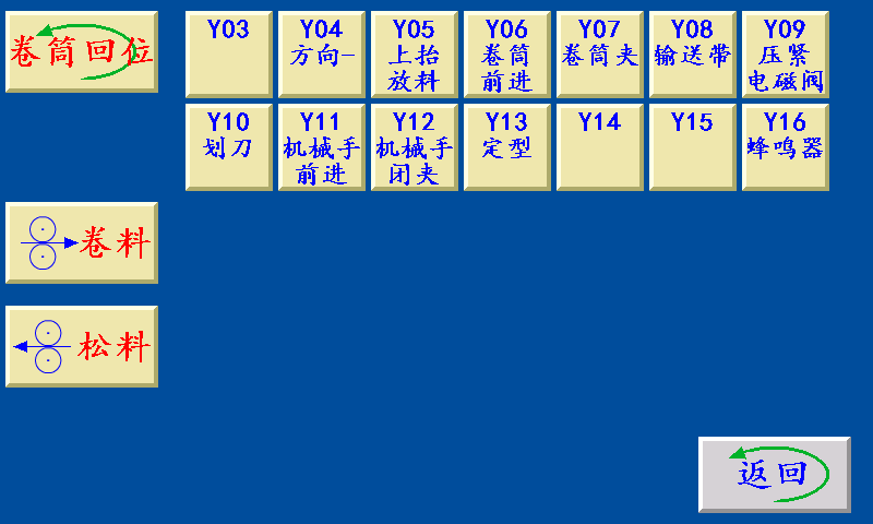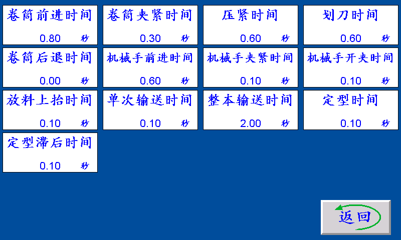 四、时间参数 卷筒前进时间:卷筒前进电磁阀输出的时间。 卷筒后退时间:卷筒后退时,卷筒前进电磁阀关闭的时间。 卷筒夹紧时间:卷筒前进时间结束后,卷筒夹信号输出卷筒夹紧时间。 放料上抬时间:卷筒夹紧时间结束后,放料上抬信号输出放料上抬时间。 压紧时间:卷筒步进(伺服)电机输出卷料长度后,压紧信号输出压紧时间。 划刀时间:压紧时间结束后,划刀信号输出划刀时间后关闭。 机械手前进时间:卷筒回到原点限位后,机械手前进信号输出机械手前进时间。 机械手夹紧时间:机械手前进时间结束后,机械手夹紧信号输出机械手夹紧时间。 机械手开夹时间:机械手夹紧时间结束后,机械手前进信号关闭机械手开夹时间后,机械手夹紧信号关闭。 单次输送时间:定型信号关闭滞后时间后,输送带输出单次输送时间。 整本输送时间:定型信号关闭滞后时间并且数量到达一批后,输送带输出整本输送时间。 定型时间:机械手开夹后,定型信号输出定型时间后关闭。 定型滞后时间:定型信号关闭定型滞后时间后,输送信号开始输出。